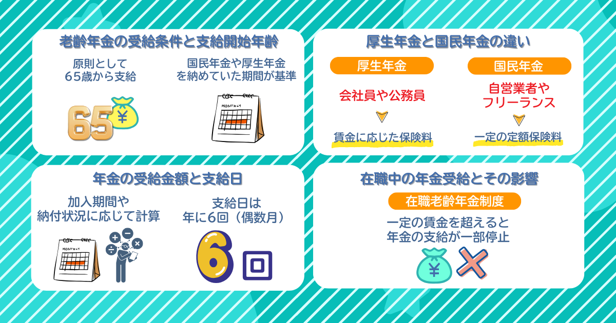 老齢年金の受給条件や支給開始年齢、厚生年金と国民年金の違い、受給金額や支給日、在職中の年金受給に関する影響など、各項目を確認し、適切な手続きを進めましょう。